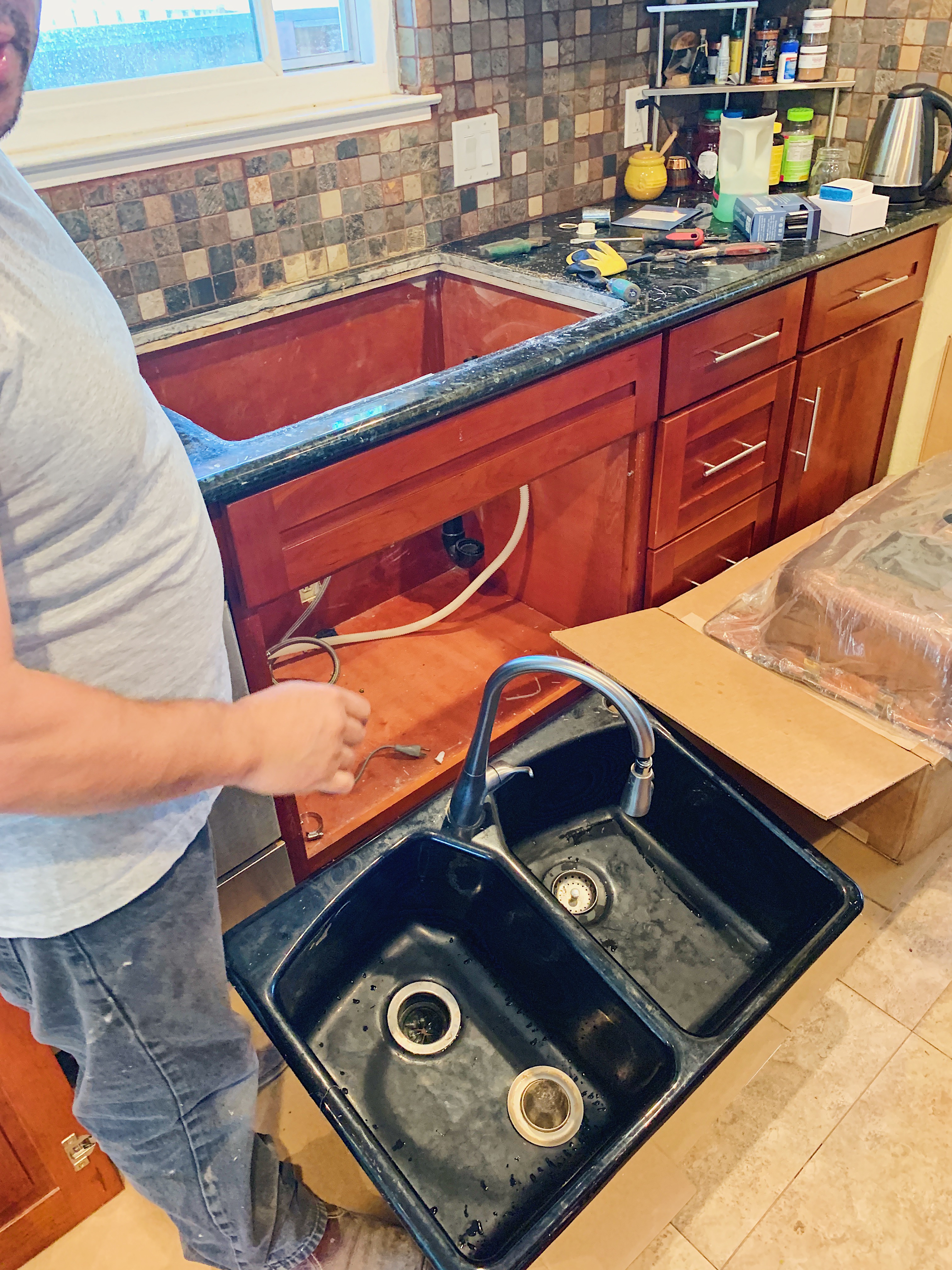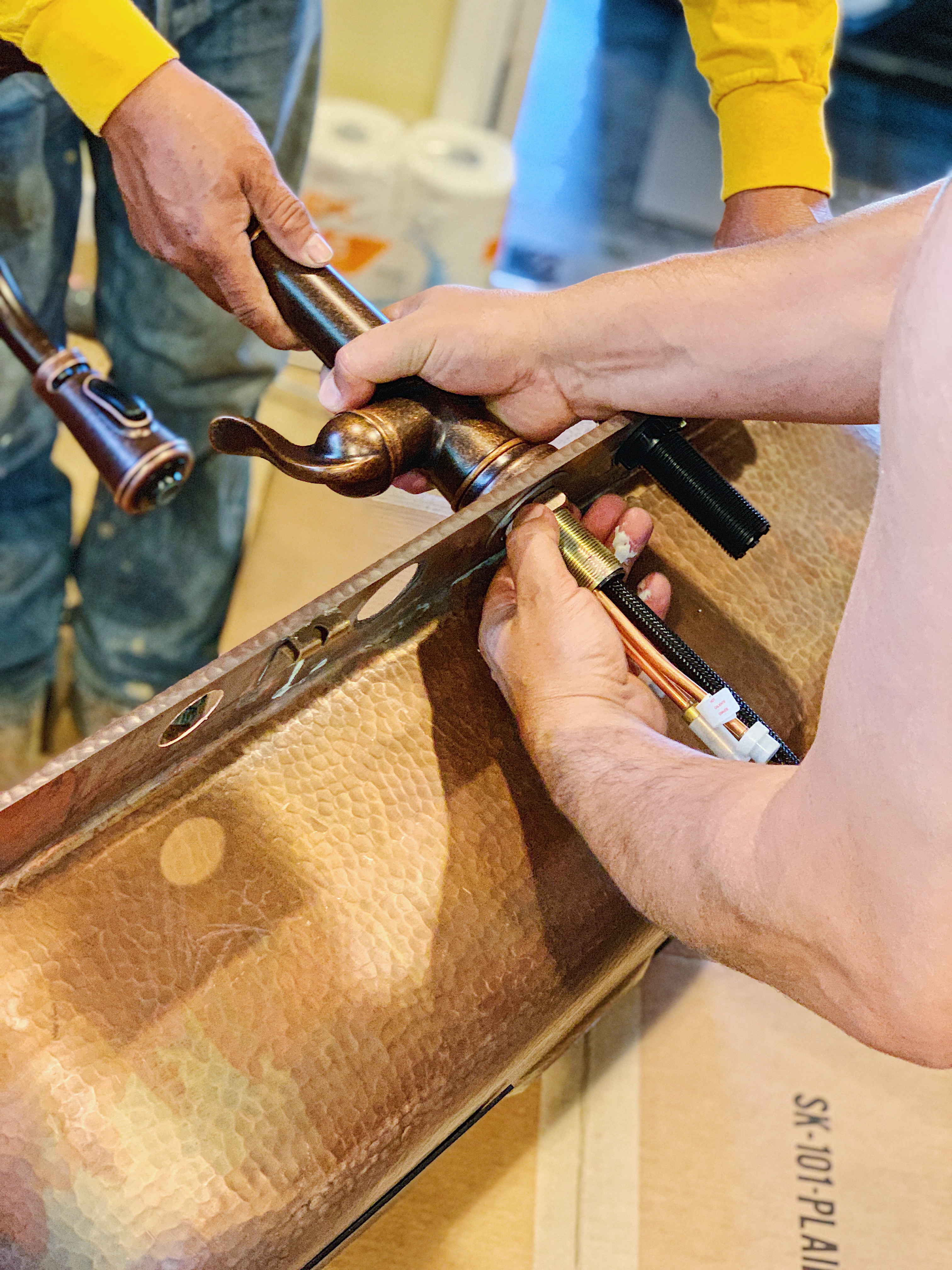 Sinkology’s Copper Sinks are all hand-hammered by artisans and made from the highest quality pure copper available. They have various styles and color variation to fit your style and needs. We decided to go with their Angelico Drop-In Copper Sink that was the same exact dimensions of our previous sink but had one big bowl instead of the 2 bowls. We went with 4 faucet holes so we would have enough holes for the soap dispenser, a garbage disposal air gap, and room for the faucet cover. We also opted for one of their all-in-one kits with the Ashfield Pfister Faucet, Disposal Drain, and Care Kit.