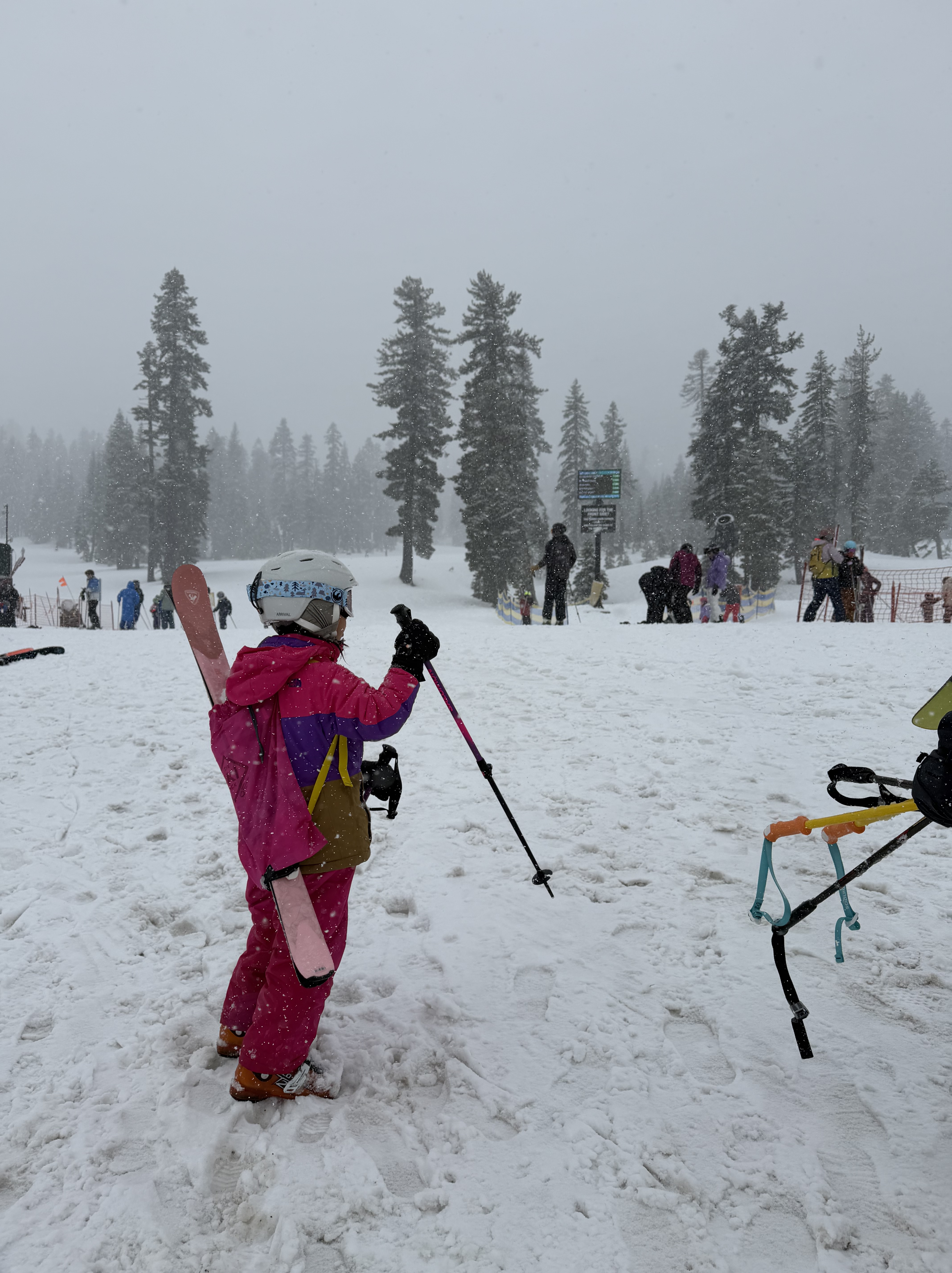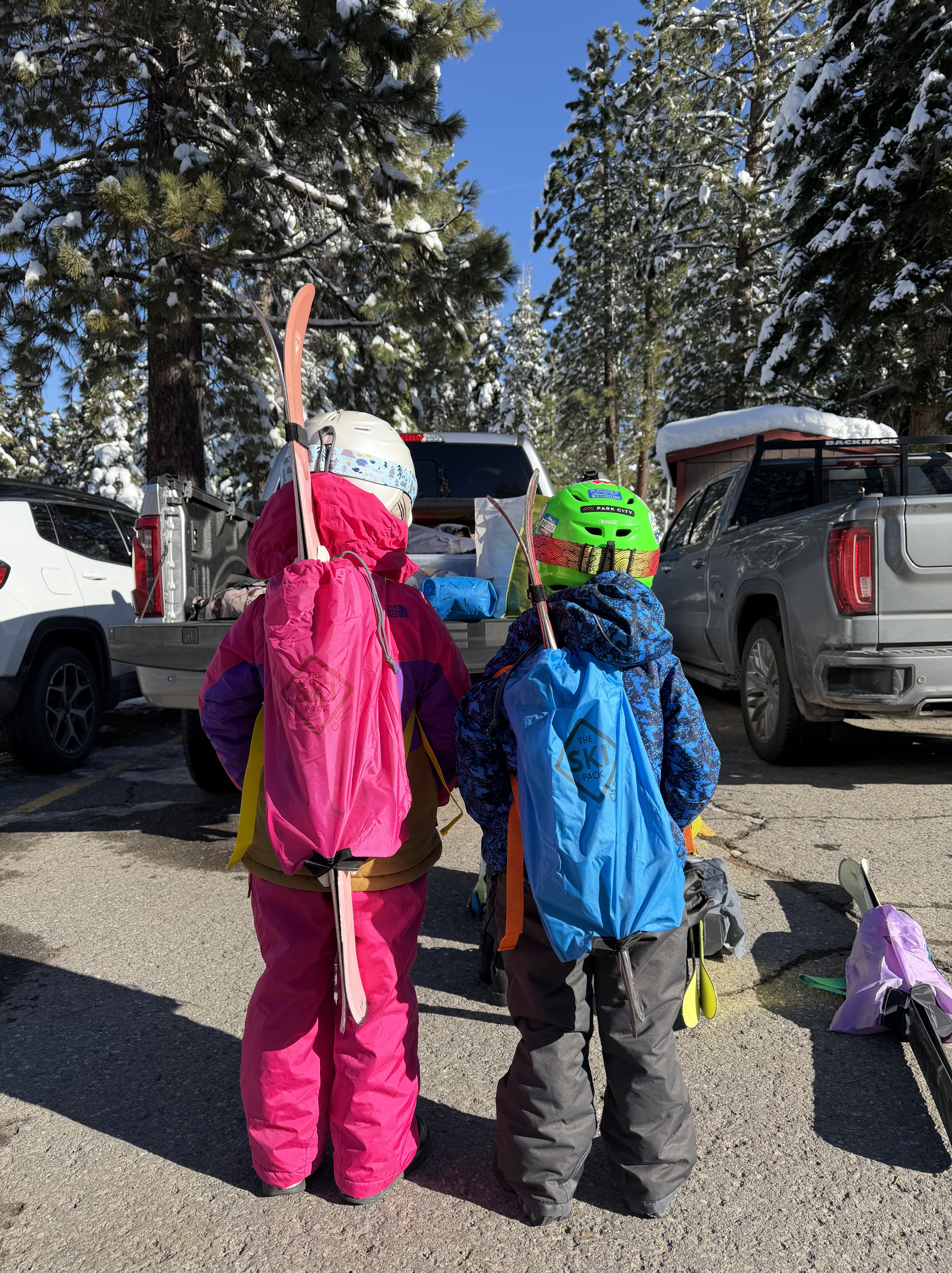 - Get a ski clip, strap, or ski pack– our kids were fine carrying their skis and poles up the mountain but were always too tired when coming back down so having something to keep the skis and poles together was a lifesaver.
